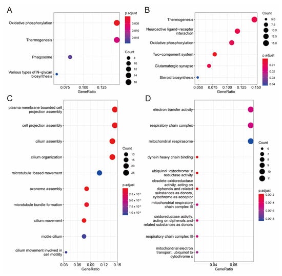In adult males, enriched pathways shifted towards reproductive and sensory functions, with a notable presence of neuroactive ligand-receptor interaction and glutamatergic synapse pathways (Figure 6B). These pathways are crucial for neural signaling required for mate-seeking and reproductive behaviors, aligning with the reproductive strategies of male Lepidoptera. Gene ontology (GO) analysis (Figure 6C,D) further underscored cellular adaptations: in the sixth instar larvae, there was enrichment in cilium organization and microtubule-based movement, while in adult males, electron transfer activity and mitochondrial respiratory chain functions were prominent, supporting increased energy metabolism necessary for reproduction and sensory responsiveness.
