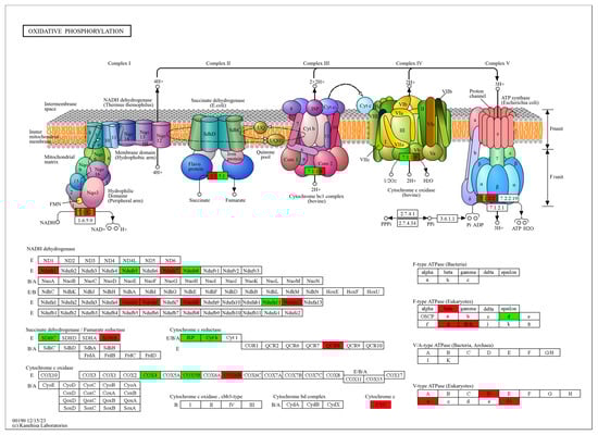Given the significant enrichment of oxidative phosphorylation among the SSGs of both the sixth instar larvae and adult male stages, we selected this pathway for detailed visualization of SSGs (Figure 7). We observed extensive representation of SSGs from both stages across the pathway. Notably, five key enzymes—NADH-quinone oxidoreductase subunit A (EC 7.1.1.2), succinate dehydrogenase flavoprotein subunit (EC 1.3.5.1), ubiquinol-cytochrome c reductase cytochrome b/c1 subunit (EC 7.1.1.8), cytochrome c oxidase cbb3-type subunit I (EC 7.1.1.9), and F-type H+-transporting ATPase subunit a (EC 7.1.2.2)—were found within the SSGs for both two stages.