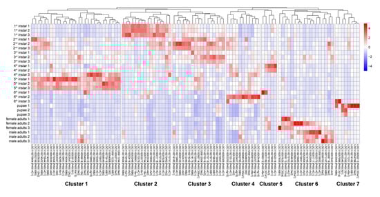 Finally, we further explored the temporal gene expression patterns of P450 genes in S. frugiperda. By employing a combination of two annotation methods, we identified 108 P450 genes within the chromosomal sequences of S. frugiperda (excluding P450 genes in contigs). We then normalized the count matrix of these P450 genes using DESeq2 and selected 104 P450 genes after removing genes with low expression levels. The results revealed that the P450 genes clustered into seven groups with distinct gene expression patterns (Figure 8). The majority of P450 genes (29 genes) were found in Cluster 1, which exhibited high expression levels in fifth instar larvae.