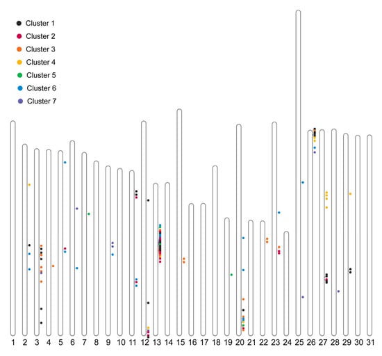 Chromosomal locations of 104 P450 genes. The dots, shown in different colors, correspond to the P450 clusters depicted in Figure 8.