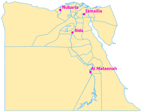 Sites of irrigation experiments run by agricultural research stations and located, respectively, in Nubaria, Ismailia, Sids and Al Mataenah across Egypt. Nubaria and Ismailia sites represent the agro-climate zone in the Nile Delta in the north, Sids represents the agro-climate zone in Middle Egypt and Al Mataenah represents the agro-climate zone in Upper Egypt in the south.