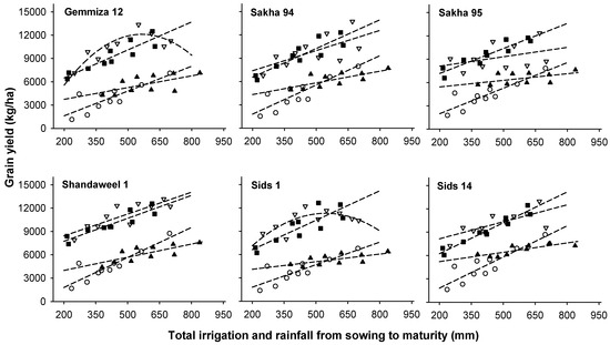 Grain yield in relation to total seasonal water input from both irrigation and rainfall from sowing to maturity for six wheat cultivars at Nubaria (▲), Al Mataenah (◼), Sids (▽) and Ismailia (○). The dashed lines are drawn from the estimated equations in Table 9.