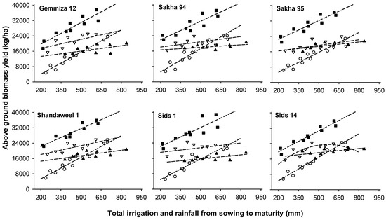 Above-ground biomass yield in relation to the total seasonal water input from both irrigation and rainfall from sowing to maturity for six wheat cultivars at Nubaria (▲), Al Mataenah (◼), Sids (▽) and Ismailia (○). The dashed lines are drawn from the estimated equations in Table 10.