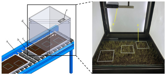 Seedling image acquisition device. (a) An automatic seedling tray conveying mechanism; (b) seedling tray; (c) auxiliary frame; (d) illuminant cabinet; (e) smartphone.