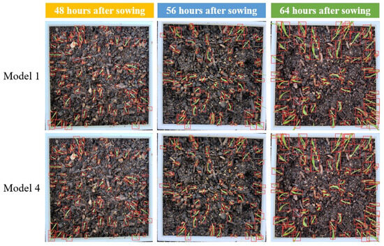 To visually demonstrate the detection performance before and after model improvement, three seedling images at different stages were selected for testing, namely 48 h, 56 h, and 64 h after sowing. Figure 4 shows the visualization results of Model 1 and Model 4 detection.