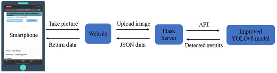 In order to detect the seedling density of hybrid rice in real-time, this paper designed and developed a portable fast estimation system of hybrid rice seedling density based on smartphones, web pages, and cloud servers, which realized the function of real-time online detection of seedling density and classification of seedling density. Image acquisition was realized by the smartphone, which accessed the detection web page through the browser and displayed the detection results. The web page was written in HTML. Its main function was to upload the seedling images to the cloud server and receive the results returned by the cloud server. The improved YOLOv8 was deployed on the cloud server through the Flask Server. The cloud server was responsible for receiving and identifying the seedling pictures uploaded from the web page and returning the detection results to the web page. The workflow and framework of the estimation system are shown in Figure 6.