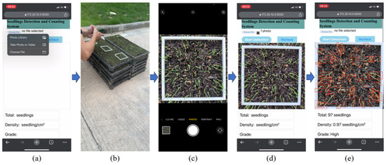Figure 7. Detection process of seedling density estimation system: (a) open the Web App through the browser; (b) place the auxiliary frame; (c) take picture; (d) sent the picture to the Flask Server; (e) display the detection results.