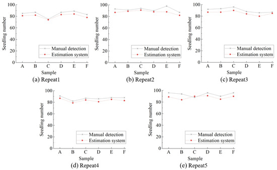 It can be seen from Table 4 that the average seedling density of 30 samples, as measured by manual detection and the estimation system, was 89.40 seedlings/100 cm2 and 84.93 seedlings/100 cm2, respectively, with a difference of 4.46 seedlings/100 cm2 and a relative error of 4.98%. In the five experiments, the coefficient of variation of manual detection ranged from 0.038 to 0.059, while it ranged from 0.033 to 0.046 in the estimation system. The relative error between manual detection and the estimation system ranged from 4.41% to 5.53%. In addition, the t-test method under equal variance was used to test the differences between the two estimates of the five sample groups, and the p-values of the tests are listed in the tenth column of Table 4. The p-values of the five experiments are 0.147, 0.037, 0.046, 0.046, and 0.020, respectively. This indicates that when the significance level is 0.01, the difference between the two detection methods is not significant. Furthermore, the detection results of the five experiments are visually displayed in Figure 8. As shown in Figure 8, under different conditions of seedling number, the detection results of the two detection methods are relatively close. Therefore, the estimation system demonstrated good detection performance overall.