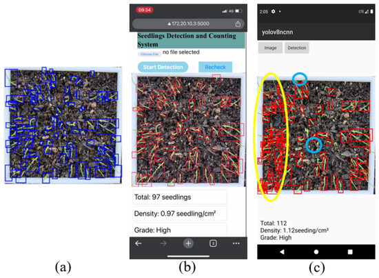 (2) To achieve fast and real-time detection of seedling density, the detection model needs to be deployed on edge devices such as mobile phones. Restricted by the hardware configuration of the mobile terminal of the mobile phone, when developing a mobile App, the model needs to be pruned and lightweight. During the research, we compared the detection results based on a Web App (Figure 9b) and mobile App (Figure 9c), as shown in Figure 9, where Figure 9a was the seedling image manual marked with LabelImg, and the number of labeled seedlings was 100. The results indicate that the detection results based on the Web App were more accurate, while the detection results based on the mobile App had large errors. The reasons were mainly in two aspects. First, the area marked by the yellow ellipse in Figure 9c had high seedling density and overlapping, resulting in a large number of redundant detection boxes and multiple detections. The second was the central area and boundary area of the seedling image marked by the blue circle in Figure 9c. The individual seedlings in these areas were relatively small and prone to missed detection. This shows that excessive pruning and lightweight will lead to a significant decline in the detection accuracy of the model. Therefore, this paper chooses to deploy the detection model on a Web App to ensure high detection accuracy and stability.