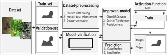 The study of common pest target detection algorithm based on improved YOLOv7-tiny includes four parts: image acquisition and preprocessing, algorithm selection and improvement, comparison and analysis of experimental results, and content summary and future outlook. As shown in Figure 1, in the overall flow chart of the pest detection method in agriculture and forestry, the first stage is the acquisition and preprocessing of images, the middle stage is the selection and improvement of algorithms, and the later stage is the evaluation of the model.