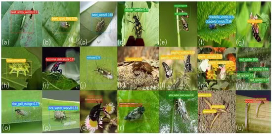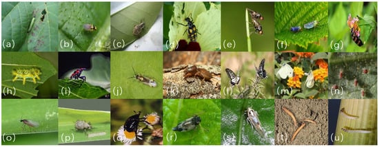 Dataset actual image: (a) beet_army_worm; (b) beet_spot_flies; (c) beet_weevil; (d) blister_beetle; (e) brown_plant_hopper; (f) cicadella_viridis; (g) legume_blister_beetle; (h) limacodidae; (i) lycorma_delicatula; (j) miridae; (k) mole_cricket; (l) papilio_xuthus; (m) pieris_canidia; (n) red_spider; (o) rice_gall_midge; (p) rice_water_weevil; (q) sericaorient_alismots_chulsky; (r) small_brown_plant_hopper; (s) white_backed_plant_hopper; (t) wireworm; and (u) yellow_rice_borer.