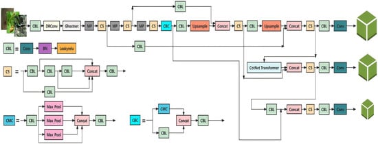 In Figure 3, the specific improved algorithm framework integrates the lightweight network module Ghostnet and the dynamic region-aware convolution module DRConv to form a new backbone network. This optimization improves model parameters and enhances computational efficiency in computer systems. We incorporated the CotNet Transformer structure into the new head structure, optimizing the model architecture and image feature extraction capability, making it more suitable for dense pest detection. We replaced the original ReLU activation function with the GELU activation function. The GELU activation function has a stronger nonlinear self-learning ability. It can extract more shallow target features and improve the detection of overlapping or slightly occluded targets. After the improvements, the proposed model is lighter and more accurate.