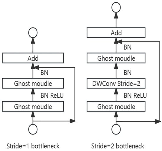 In this paper, the Ghostnet module is integrated into the backbone, as shown in Figure 4; the structure of the Ghostnet module is composed of two bottleneck modules. When passing through the first bottleneck module, the step size is 1, and there are two different Ghost module modules inside. The first one is used to increase the number of channels (expansion layer), the ratio between the output and input channels is specified as the expansion ratio, and the second one is used to decrease the number of channels to match the shortcut branch. The first Ghost module is used to increase the number of channels (expansion layer), which specifies the ratio between the number of output and input channels as the expansion ratio, and the second Ghost module is used to reduce the number of channels to match the shortcut branch; when passing through the second bottleneck module, the step size is 2, and the structure is similar to that of the first Ghost module, but with a step size of 1 between the two Ghost modules, and a step size of 1 between them. The structure is similar to the first Ghost module, except that a deep convolutional layer with a step size of 2 is added in the middle of the two Ghost modules.