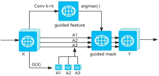 In this paper, Dynamic Region-Aware Convolution (DRConv) is an improved convolution operation designed to enhance the feature extraction capability of Convolutional Neural Networks (CNNs) by incorporating a dynamic region-aware mechanism. As shown in Figure 5, the guided feature is first generated through standard convolution [] and then the spatial dimension is divided into multiple regions based on the guided feature. A convolution kernel generation module, G(·), is created based on the input image. The convolution kernel generation module G(·) dynamically generates the corresponding convolution kernel for each region according to the input image, allowing it to autonomously learn and match different convolution kernels for different pixel positions. This approach not only has strong feature expression capabilities but also maintains translation invariance. The dynamic generation of convolution kernels reduces a large number of parameters compared to local convolution, and the overall computation is nearly equivalent to that of standard convolution.