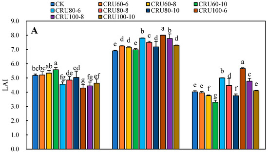 Leaf area index (LAI) of rice under one-time reduced basal application of controlled-release nitrogen fertilizer with increased planting density in 2021 (A) and 2022 (B). Different lowercase letters indicate statistical significance at the 0.05 probability level in each year. Different capital letters (B) indicate statistical significance at the 0.05 probability level of average values from both years. Bars mean standard error (n = 3). CK: conventional split fertilization treatment with 300 kg ha−1 of N and a planting density of 4 seedlings/hole; CRU60-6, CRU60-8, CRU60-10, CRU80-6, CRU80-8, CRU80-10, CRU100-6, CRU100-8, and CRU100-10: controlled-release N fertilizer of 60, 80, and 100 days with 225 kg ha−1 of N and a planting density of 6, 8, and 10 seedlings/hole.