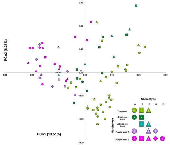 Principal coordinate analysis (PCoA) based on Dice’s distances between 80 basil accessions classified into morphotypes and chemotypes. Numbers on the legend correspond to number of accessions classified as morphotype/chemotype combination.