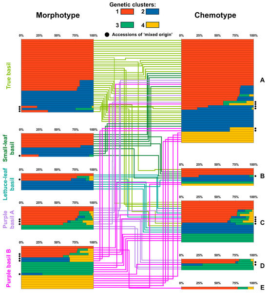 Genetic structure of basil accessions derived from Bayesian analysis using BAPS showing the distribution of genetic clusters within classified chemotypes and morphotypes. The colored lines indicate morphotypes and connect the same accession in morphotype and chemotype classifications.