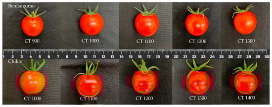 Photographs of “Benisuzume” and “CF Chika” cherry tomatoes at each CT level.