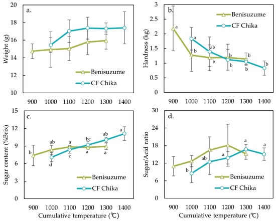 Fruit weight (a), hardness (b), sugar content (c), and sugar/acid ratio (d) measured for “Benisuzume” and “CF Chika” cherry tomatoes. The letters shown near each point denote significantly different average values based on Tukey test at p-value ≤ 0.05.