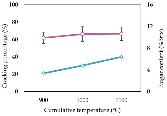 Percentage of fruit cracking in “Nene” tomatoes at CTs of 900, 1000, and 1100 °C (the trends for sugar content and cracking percentage are indicated in purple and blue, respectively).