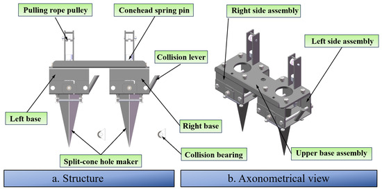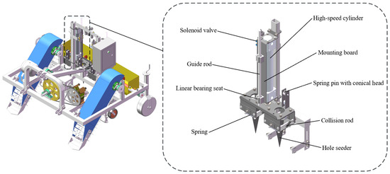 - Xiang, W.; Wu, M.; Guan, C.; He, Y.; Luo, H.; Yan, B. Design and Test of Transplanting Hole-forming Machine for Rapeseed Potted Seedlings. Trans. Chin. Soc. Agric. Mach. 2017, 48, 40–48+58. (In Chinese) [Google Scholar]