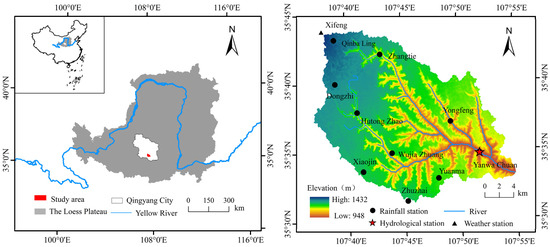The watershed spans 367.5 square kilometers with elevations ranging from 948 to 1432 m above sea level, as depicted in Figure 1. Located in the semi-humid monsoon climate zone, it experiences an average annual rainfall of 552.8 mm (2000–2016) and a mean annual temperature of 10.1 °C, with 78.6 percent of the annual precipitation occurring between May and September. The area is situated in the southern part of the river basin. The geomorphology of the watershed is mainly composed of three types: Loess, beam, and mountain slopes and gullies, which account for 53.7%, 17.7%, and 28.6% of the total area, respectively [30]. The watershed exhibits typical landform characteristics of the Loess Plateau gully region. The geological structure of the Yanwachuan watershed is relatively homogeneous, and the ground surface is mainly covered by Quaternary loess that can be up to about 200 m thick [3,31]. Soil erosion is a massive problem. To control soil erosion, an experimental study on comprehensive watershed management in the Yanwachuan watershed, a typical mesoscale watershed of the Loess Plateau gully area, was conducted by the Xifeng Water Conservation Station of the Yellow Commission in 1975. Figure 2 presents the land use patterns in 2000 and 2010, revealing that grassland and agricultural land constitute the primary land use types within the watershed. Furthermore, it is evident that a significant amount of agricultural land underwent conversion to construction land and grassland during this period. By the end of 2012, the area treated by soil and water conservation measures had reached 238.59 square kilometers, with a treatment rate of 68.96% [3,32].