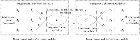 Partial least squares structural equation modeling (PLS-SEM) is predominantly employed to examine causal links among latent variables [44]. In theoretical models, we can measure the causal relationships between potential variables using the corresponding observed variables. A PLS-SEM model has two main components: measurement and structural models [45] (Figure 3). The measurement model is an expression of the relationship between the observed and latent variables. The relationship between exogenous and endogenous latent variables is expressed in the structural model. The results of the path analysis are visualized using path coefficient β, which indicates the direction and strength of causal relationships between latent variables [46]. The external model loadings show how the explicit variables respond to the latent variables. In a linear system, direct effects are denoted by the relevant path coefficients, while indirect effects refer to the paths that involve intermediate variables. The total effect is the cumulative result of both the direct and indirect effects that elucidate the connection between the variables. The goodness of fit (GOF) refers to the accuracy of the predictions made by the model and is calculated as follows [47,48]:
