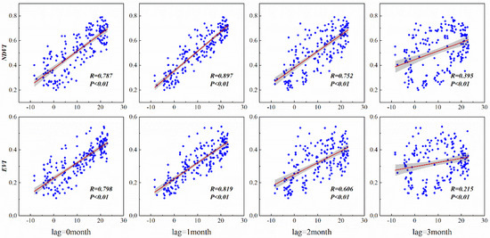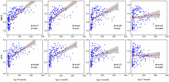 Various delays (0–3 months) in the Yanwachuan watershed, scatterplots, and correlation coefficients of chosen vegetation indicators and precipitation. Coefficients of correlation (R) and p-values are displayed in the graphs.