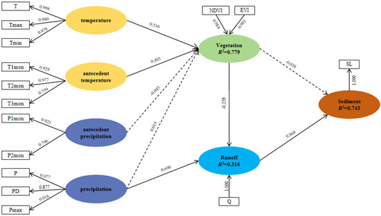 PLS-SEM was utilized in this study to separate the influences of plant cover and climate change on runoff and sediment. This enabled the quantification of the individual contributions of climate change and vegetation dynamics to runoff and sediment, as depicted in Figure 7. The correlations between each latent variable and its corresponding observed variable in the model were significant, above a threshold of 0.7. This suggests that the latent variables effectively captured the observed variability. The model demonstrated a goodness of fit (GOF) value of 0.641 (>0.5), indicating a satisfactory simulation [15]. The model findings demonstrate that both temperature and antecedent temperature have a considerable and direct impact on vegetation, with β values of 0.510 and 0.493, respectively. Furthermore, these factors also influence runoff and sediment via their effects on vegetation. Precipitation significantly impacts vegetation and runoff, with respective coefficients of 0.690 and 0.015. No substantial correlation was seen between antecedent precipitation and vegetation. This study revealed that runoff, with a beta coefficient of 0.869, had a substantial and direct impact on sediment. The presence of vegetation hurt sediment, with a coefficient of −0.038. Climatic factors explained 77.9% of monthly vegetation dynamics, and climatic and vegetation dynamics explained 31.6% of monthly runoff variability. Moreover, 74.3% of the monthly sediment variability was explained by vegetation dynamics, climatic factors, and runoff.