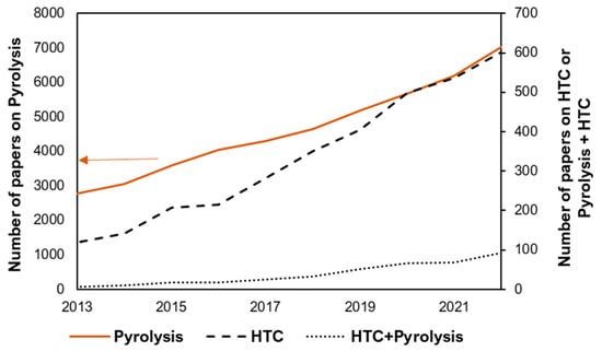 One factor hampering the massive spreading of HTC technology can be its apparent competition with traditional pyrolysis. A bibliographic search of both processes using the keywords “pyrolysis” and “hydrothermal carbonization” on the Web of Science in the time period 2013–2023 gives, respectively, a total of 6839 and 736 citations (25 September 2023, only research and review papers considered). The combined use of both concepts gives a total of 466 references; of them, only a few really compare both processes regarding a given feedstock or make an analysis about the convenience of using one of them separately or using them together, complementarily (Figure 1).