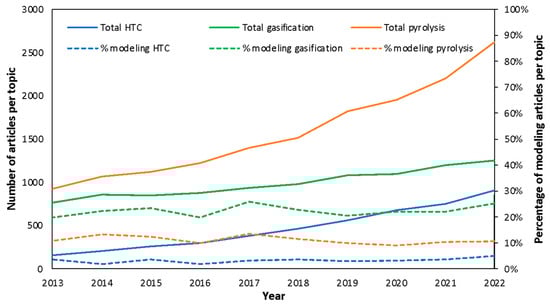Number of yearly published articles and percentage of modeling articles on HTC, biomass gasification, and pyrolysis according to the Scopus database as of 18 August 2023.