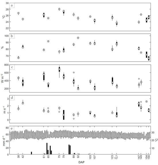 Variation in Ta (a), HR (b), Rs (c), and Vv (d) every five minutes during the monitoring hour with the portable automatic station. Daily variation in Ta and cumulative precipitation during crop development (e) with the Vista Florida SENAMHI automatic station.