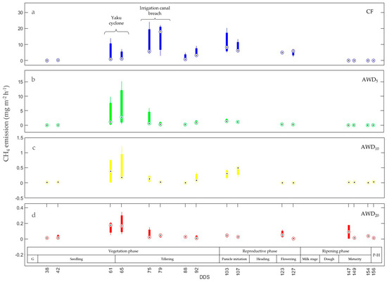 Temporal Variation of CH4 Flux () during the crop development under CF irrigation regimen (a), AWD5 (b), AWD10 (c), and AWD20 (d).