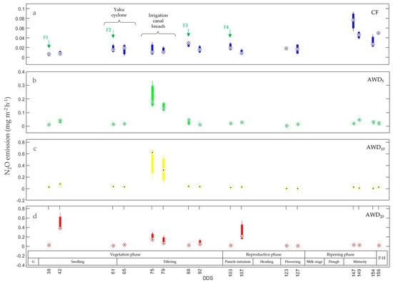 Temporal Variation of N2O Flux () during the crop development under CF irrigation regimen (a), AWD5 (b), AWD10 (c), and AWD20 (d).
