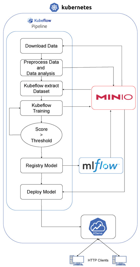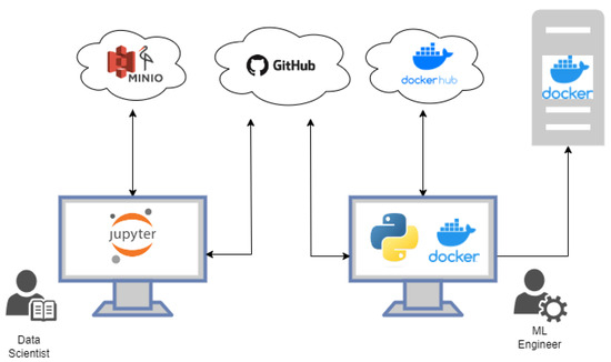 Some studies have concentrated on the MLOps paradigm from a theoretical point of view [46], while others have presented various tools which could be applied in an MLOps platform [40,47]. Additionally, several studies have implemented portions of the overall solution [48,49]. However, there is a noticeable gap in the MLOps literature, providing a solution that integrates all these components, offering a first approach for a functional and tested MLOps architecture.