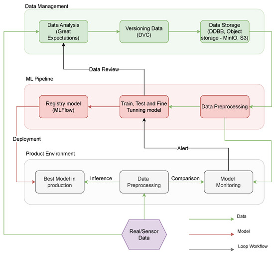To address these issues, a new paradigm known as Machine Learning Operations (MLOps) has emerged. Its objectives are twofold: (1) automating the process of building ML models and deploying them to production; and (2) maintaining and monitoring these models throughout their whole life cycle to detect potential issues which could compromise the AI model’s performance and automate a response [22,23,24], increasing the efficiency and scalability, as well as reducing the potential risks. By embracing MLOps culture, developers unlock the advantages of optimized workflows, automated AI model deployment, and effective collaboration, leading to increased productivity and robustness, faster development cycles, and better performance of their AI models.
