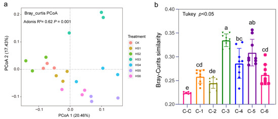 The PCoA analysis showed that the structure of the bacterial community was significantly separated and differed among years of succession of honeysuckle (Figure 2a). The principal component axes PCoA1 and PCoA2 explained 20.46% and 17.43% of the variation, respectively. HS1 and HS2 were closer together but separated from HS5 and HS6 by Axis 1, showing that the bacterial communities were more similar after 1 and 2 years of successive planting, but HS3 was significantly separated from all samples, indicating that the greatest differences in bacterial communities were found in the third year. This result was confirmed by the Bray–Curtis distance similarity clustering analysis (Figure 2b). The comparative analysis of distance similarity between microbial communities showed that the greatest differences in CK were in the third year.