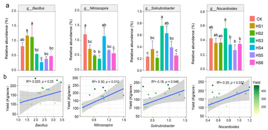 The relative abundance of some bacteria, including Bacillus and Lysobacter, started to decrease significantly by the third year of continuous honeysuckle cultivation. However, some taxa were also enriched in the sixth year, for example, Sphingomonas (Figure 3d). The relative abundances changed in different years of crop succession for some genera, such as Bacillus, Nitrospira, Soilrubacter and Nocardioides (Figure 4a). Linear regression analysis showed that the relative abundance of Nocardia and Nitrospira, Soilrubrobacter and Nocardioides were significantly and positively correlated with honeysuckle yield (Figure 4b).