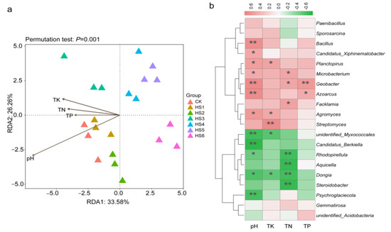 Redundancy analysis (RDA) of bacterial community at phylum level and soil physicochemical properties (a). Spearman’s correlation analysis of soil properties and the abundance of bacteria at genus level (b). TN: total nitrogen; TP: total phosphorus; TK: total potassium. *, p < 0.05; **, p < 0.01.