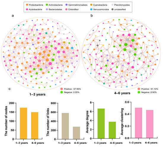 Bacterial co-occurrence network at different years of continuous cropping: 1–3 years (a); 4–6 years (b). Various network topological parameters include nodes, links, average degree and average clustering (c).