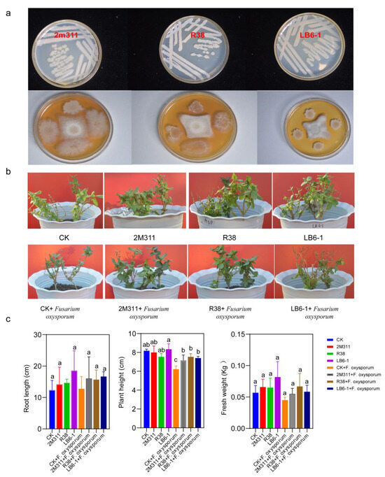 To determine the inhibitory ability of the isolates, 61 strains were cultured in double culture (Table S3), of which three strains with the strongest antagonistic ability were selected for subsequent experiments (Table 2). The inhibition rates of these three strains, 2M311, R38 and LB6-1, against Fusarium oxysporum pathogens were 48.66%, 69.66 and 74.66%. The three colonies were white, opaque, and round in shape, with a wrinkled surface and slightly raised edges, and were Gram-positive (Figure 7a). The results of PGPR characterization of these strains showed that they grew well on an Ashby nitrogen-free medium; LB6-1 and 2M311 were phosphate soluble and showed clear zones of phosphate solubility around bacterial colonies based on organophosphate and inorganic phosphate plate and produced indole acetic acid (IAA) (Figure S5, Table S4). In addition, R38, LB6-1 and 2M311 all have protease and β-glucanase activity, but only strain LB6-1 exhibits chitinase activity (Figure S6).