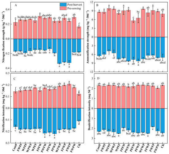 Effect of different rotation patterns on soil nitrogen conversion intensity: (A) Nitrogen fixation, (B) Ammonification, (C) Nitrite reductase, (D) Denitrification. Bars show mean standard error, and different lowercase letters above the bars indicate that the difference was significant at p < 0.05 under the LSD test.
