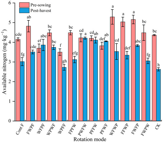 Effects of different crop rotation sequences on soil available nitrogen. Bars show mean standard error, and different lowercase letters above the bars indicate that the difference was significant at p < 0.05 under the LSD test.
