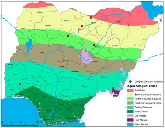 The testing sites cut across three different agroecologies in Nigeria, which are also the key cowpea growing zones (Figure 1). These agroecological zones include derived Savanna, Northern Guinea savanna, and semi-arid/Sudan savanna.