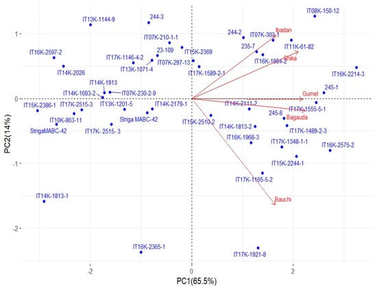 PC1*PC2 indicated that the Ibadan and Shika environments were closely related to genotypes G41 (IT11K-61-82), G10 (IT07K-303-1), and G28 (IT16K-1984-2) (Table 1), suggesting that they are the most suitable for these environments. Gumel and Bagauda were also closely related, with genotypes G37 (IT17K-1555-5-1), G5 (245-1), and G6 (245-8) being the most adapted to these sites.