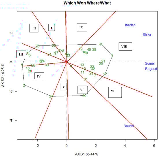 The specific adaptation of the genotypes was assessed using the Which Won Where model of the GGE biplot (Figure 3). In this analysis, principal components 1 and 2 explained 79.69% of the total variation. Nine mega environments (sectors) were identified by the Which Won Where’ biplot, with Ibadan, Shika, Gumel, and Bagauda all falling within the same mega environment. Genotype G41 (IT11K-61-82), appeared to be the best for Ibadan and Shika, as it was located closer to these two environments on the biplot. On the other hand, genotype G5 (245-1) was the best for Gumel and Bagauda. Bauchi fell within another mega environment, and G30 (IT16K-2365-1) was the best genotype for that environment. These inferences are based on the proximity of each genotype to the respective environments in the biplot.