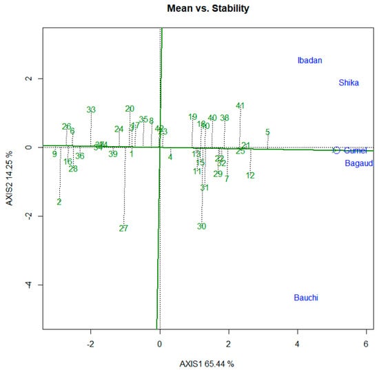 GGE biplot presenting mean versus stability for grain yield data across five locations. The green numbers are the codes for the genotypes tested; the blue texts are the names of the locations: Bagauda—Kano state; Bauchi—Abubakar Tafawa Balewa University (ATBU), Gubi in Bauchi state; Ibadan—Oyo state; Shika—Kaduna state; Gumel—Jigawa state.