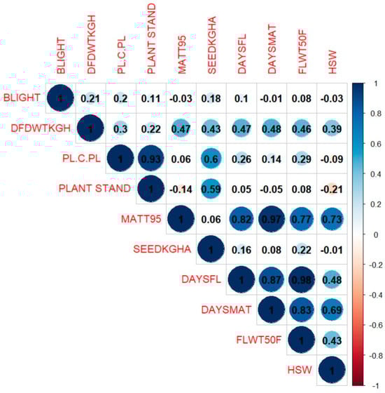 Relationship between phenology, yield components, and bacteria blight incidence for elite cowpea lines evaluated across five locations in Nigeria. BLIGHT—bacteria blight, DFDWTKGH—dried-fodder weight kg/ha, PL.C.PI—number of plants per hill, PLANT STAND—number of plant stands at harvest, MATT95—days to 95% maturity, SEEDKGHA—grain yield kg/ha, DAYSFL—days to first flowering, DAYSMAT—days to first pod maturity, FLW50F—days to 50% flowering, HSW—100-seed weight. The scale on the right side of the figure indicates the strength and direction of the correlation; deep blue—highly positively correlated and deep red—highly negatively correlated. The size of the circles also reflects the strength of the correlation.