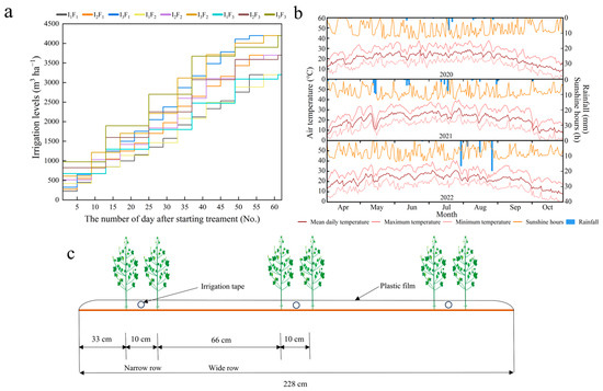 To facilitate the seedling establishment, a flood irrigation of 180 mm was applied to the field plot before sowing. In-season irrigation was conducted using an under-mulch drip irrigation system as outlined (Figure 1c). During the seedling stage, no irrigation was applied, and two irrigations, each with an amount of 45 mm, were conducted during the squaring stage. Comprising three irrigation amounts (I1: 320 mm; I2: 370 mm; I3: 420 mm) and three irrigation frequencies (F1: every 4 days; F2: every 8 days; F3: every 12 days), these treatments were arranged in a randomized block design with three replications, totaling 9 irrigation treatments and 27 plots (Figure 1). The irrigation strategy of 420 mm amount and 12-day interval represents the regular local practice. It should be noted that the irrigation amount here actually represents the total amount of water applied, including both irrigation and rainfall. Specifically, the amount of water for each irrigation is determined by subtracting the rainfall received from the last irrigation from the current one from the designed irrigation amount. Each plot, with an area of 63.84 m2, maintained a planting density of 195,000 plants ha−1. Following the cultivation technique known as “one film, three irrigation tapes, and six cotton rows,” cotton plants were arranged in wide and narrow rows (66 cm + 10 cm). Drip irrigation lines were positioned at the center of the narrow rows (Figure 1). The cultivars used were CRI619 in 2020 and Xinluzhong 82 in 2021 and 2022, both being primary cultivars in the local area. Fertilization was consistent across treatments, with the application of 4.8 t ha−1 of organic fertilizer, 225 kg ha−1 (46.4% N) of urea, and 300 kg ha−1 (46% P2O5). Disease and pest control, as well as chemical regulation, were conducted according to local practices and maintained consistently across all treatments. The growth regulator used in this study is mepiquat chloride (MC). The regulation began after the emergence of cotton and was conducted a total of nine times throughout the growing season. The total amount of MC applied was 480 g hm−2. The planting dates for the years 2020, 2021, and 2022 were 21 April, 20 April, and 21 April, respectively, while the harvest dates were 10 October, 10 October, and 11 October, respectively.