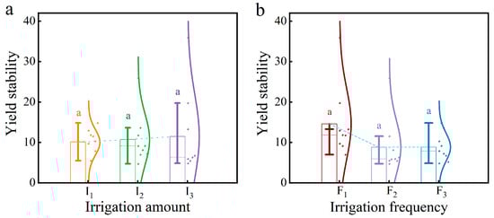 Analyzing the data over the three years revealed significant variations in cotton yield stability among different treatments (Figure 2). The results showed that an increased irrigation amount resulted in higher yield stability. Compared to medium and low irrigation amounts, high irrigation amounts increased yield stability by 6.9% and 14.4%, respectively. In addition, high-frequency irrigation increased the yield stability by 6.6% and 6.5% relative to medium and low irrigation frequencies, respectively.
